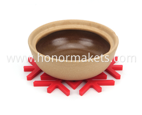 This Kitchen Tools is a beautiful snowflake shaped silicone heat mat. POTS, bowls, cups can be placed on the top, effective insulation, will not damage the table. Silicone material, very lightweight and convenient, non-stick, easy to clean.Safe for dishwasher, microwave, oven, freezer.